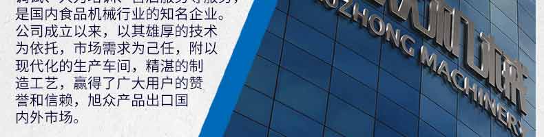 廣州旭眾食品機械有限公司是一家集科研開發(fā),生產(chǎn)設(shè)計,營銷服務(wù)為一體的現(xiàn)代化生產(chǎn)企業(yè)。現(xiàn)代化生產(chǎn)車間,精湛制造技術(shù),所產(chǎn)機械歷經(jīng)市場重重考驗,不斷贏得海內(nèi)外客戶的贊譽。